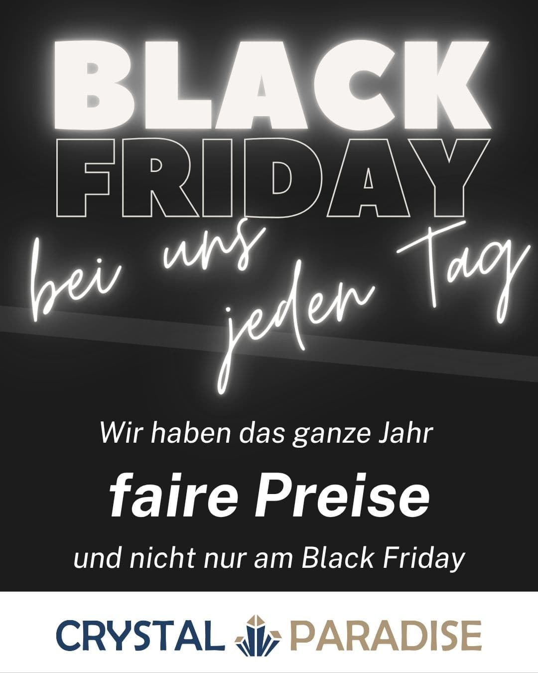 Bei Crystal Paradise glauben wir an Transparenz, Fairness und echte Wertschätzung – nicht nur an einem Tag im Jahr. Deshalb arbeiten wir ohne Zwischenhändler und beziehen unsere Kristalle und Edelsteine direkt aus den Herkunftsländern. So können wir eine hohe Qualität sicherstellen und gleichzeitig faire Preise anbieten – dauerhaft, nicht nur zu Werbeaktionen wie dem Black Friday.