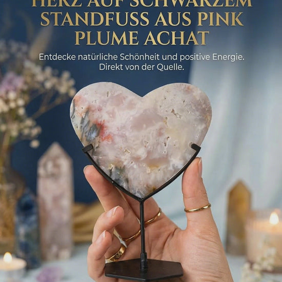 Herz auf schwarzem Standfuss aus Pink Plume Achat
